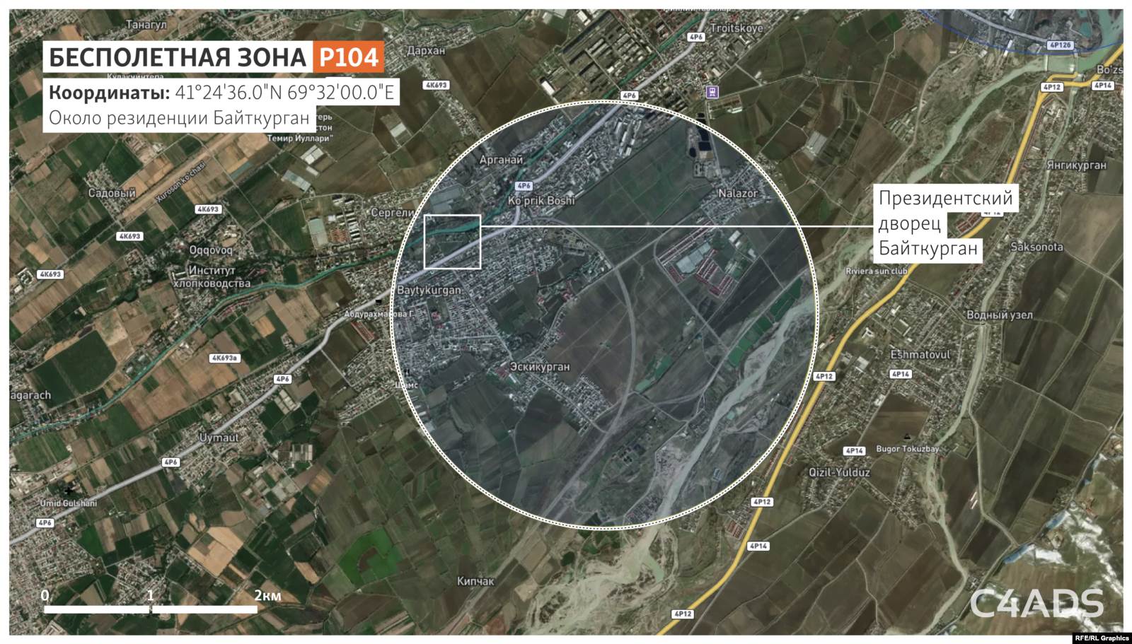 Центр этой бесполетной зоны находится над благоустроенным садово-парковым горным участком примерно в 200 м от двух вертолетных площадок и в 350 м от особняка, построенного, по данным источников, для Мирзиёева.