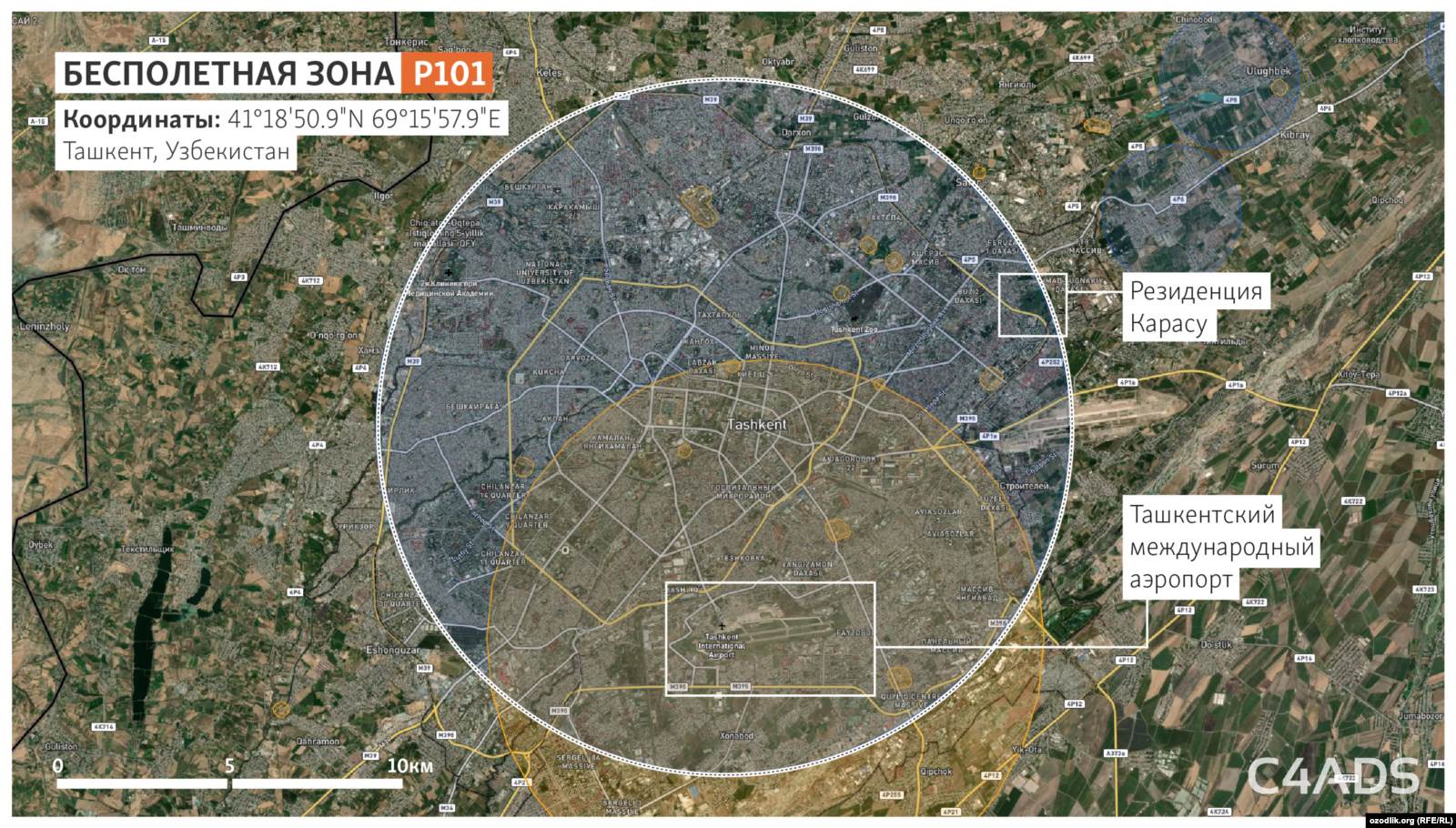 Это самая большая бесполетная зона в Узбекистане радиусом 10 км, покрывающая почти всю территорию Ташкента, в том числе большую часть территории резиденции Мирзиёева «Курасу».