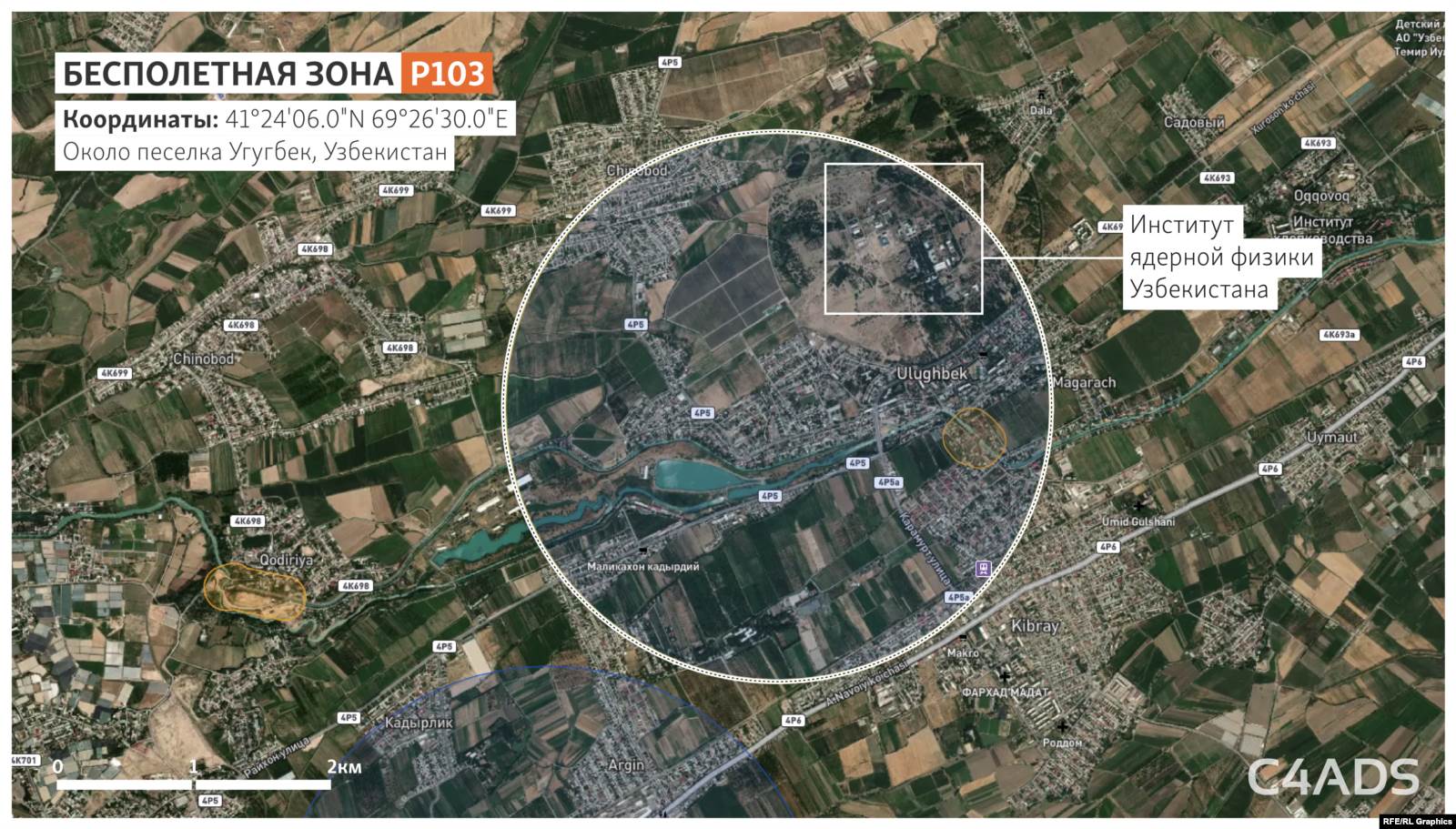 Журналисты Озодлика не смогли обнаружить ничего похожего на резиденцию Мирзиёева в этой бесполетной зоне. Однако там находится Институт ядерной физики Академии наук Узбекистана.