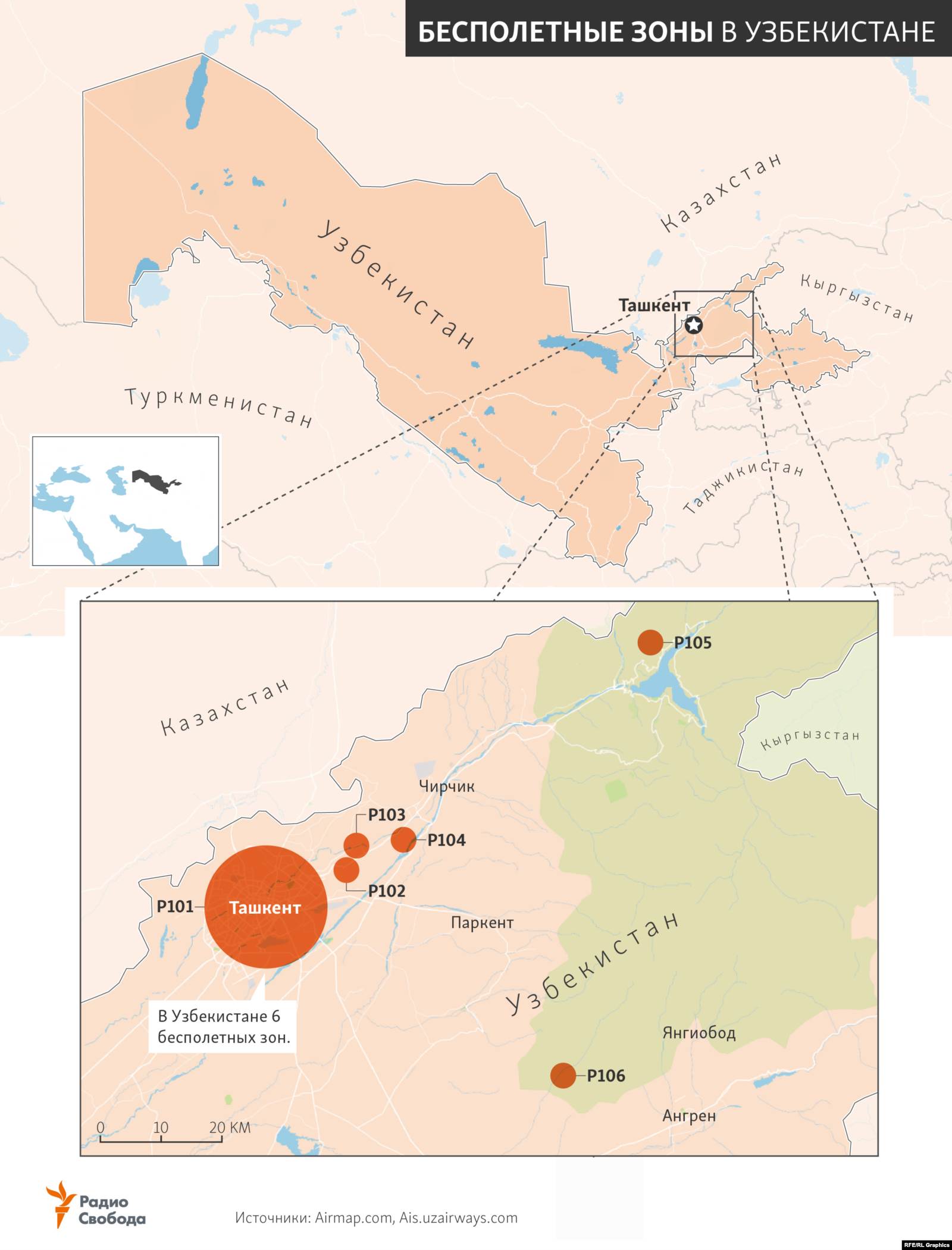 Всего в Узбекистане шесть таких бесполетных зон, согласно анализу аэронавигационных данных, проведенному Озодликом и вашингтонской некоммерческой исследовательской группой C4ADS.