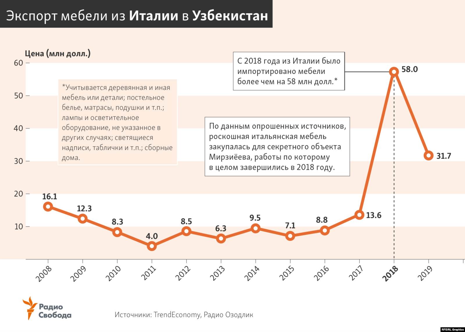 Однако из этих данных невозможно вычислить, какое количество импортированной из Италии мебели было отправлено в комплекс Шоввозсой. Кроме того, эти данные не указывают информацию об итальянских компаниях-производителях и о покупателях из Узбекистана.